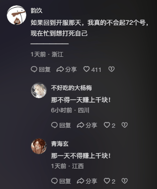 还有玩家表示:“你才36个号,我每天要做72个号”,按照搬砖哥的说法,这位的工作量应该已经要开始修仙了吧!