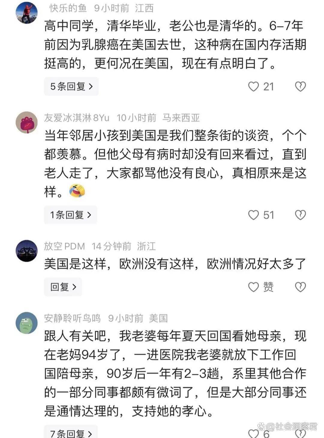 针对此事,有网友评论,当年邻居小孩到美国是我们整条街的谈资,个个都羡慕。但他父母有病时却没有回来看过,直到老人走了,大家都骂他没有良心,真相原来是这样。